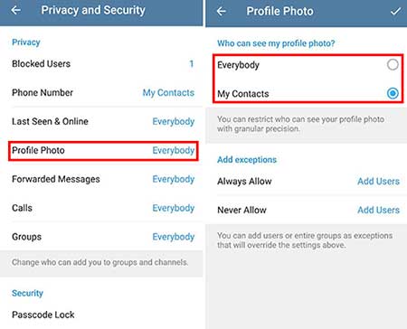 برای مخفی کردن عکس پروفایل تلگرام میبایستی علامت گزینه my contacts را فعال نموده تا تصویر پروفایل تنها برای مخاطبانمان قابل رویت باشد.
