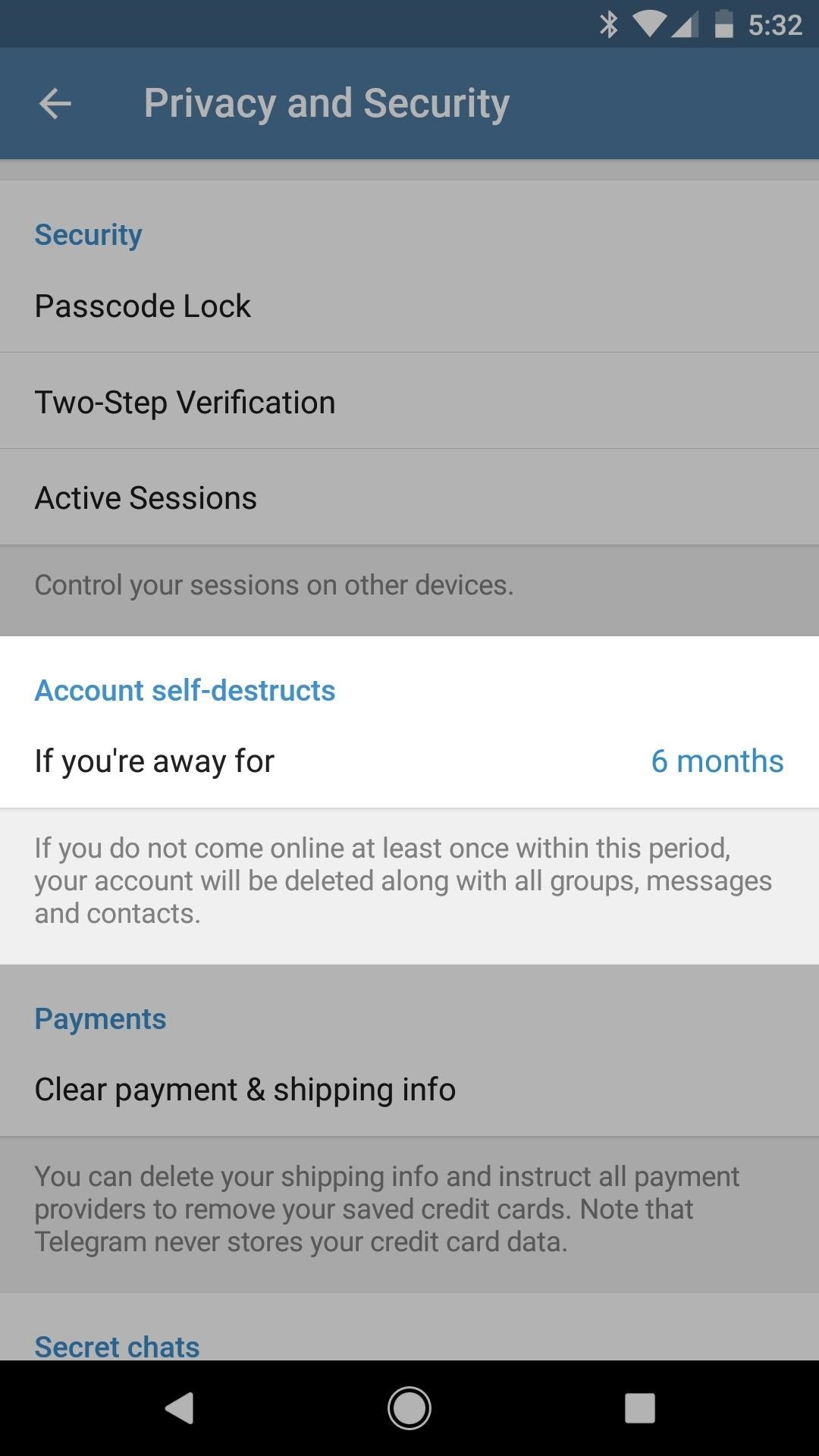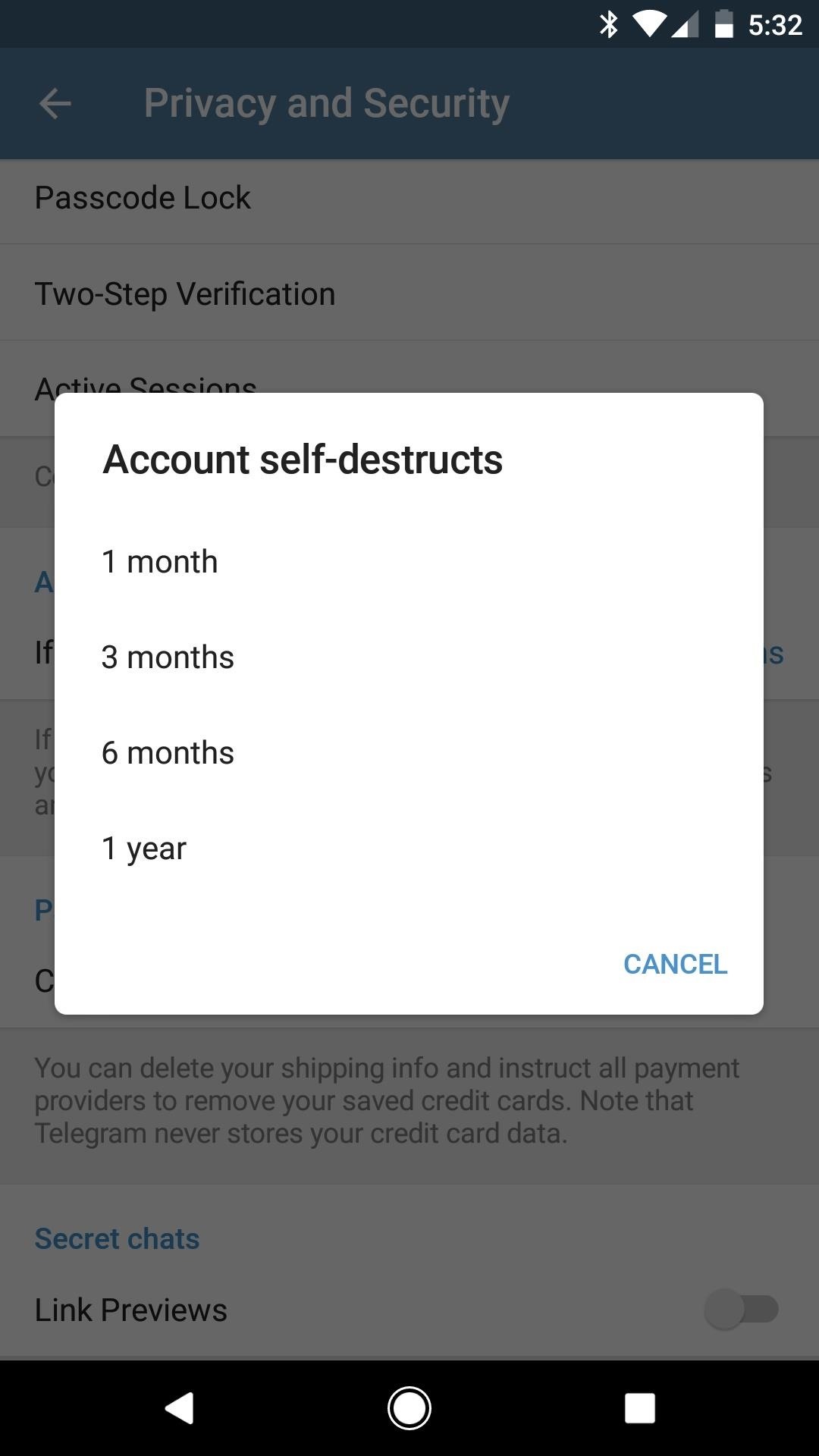 به همین سادگی بازه زمانی دیلیت خودکار حساب تلگرام تغییر پیدا می‌کند. شما می‌توانید بازه زمانی دلیت یا حذف خودکار اکانت خودرا برابر با یک ماه ، سه ماه ، شش ماه یا یک سال در نظر بگیرید. برای مثال اگر گزینه شش ماه را انتخاب کنید، چنانچه برای مدت زمان شش ماه اکانت تلگرامتان فعال نشود و آنلاین نگردید، این اکانت به طور اتوماتیک از بین رفته یا دیلیت می‌شود.